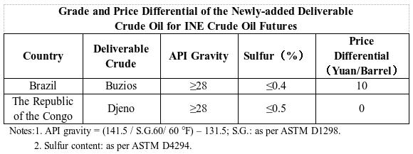 The grade and price differential of the newly-added deliverable crude oil are stipulated as follows: